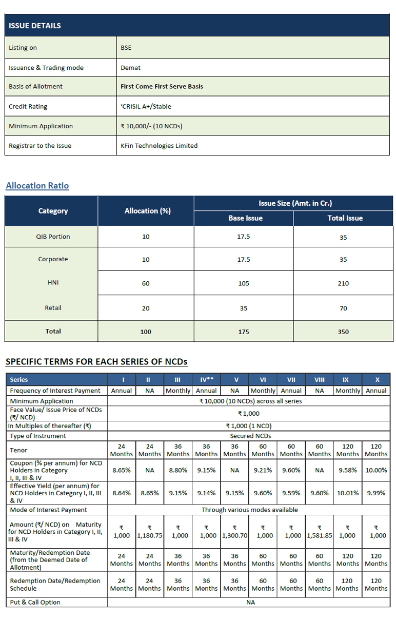 2. With respect to Series where interest is to be paid on monthly basis, relevant interest will be paid on the first date of every month on the face value of the NCDs. The last interest payment under monthly Series will be made at the time of redemption of the NCDs. For the first interest payment for NCDs under the monthly options, interest from the Deemed Date of Allotment till the last day of the subsequent month will be clubbed and paid on the first day of the month next to that subsequent month.